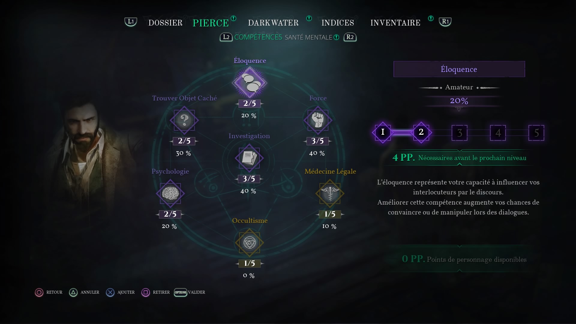Ces sept compétences vous permettront de débloquer des séquences de dialogues inaccessibles ou de faire un “test”, à l'instar du jeu de rôle papier. Les tests peuvent autant se trouver dans les dialogues, afin de tenter d’intimider ou de convaincre votre interlocuteur, que pour crocheter des portes, soulever de lourds objets, etc. Ces compétences vous permettront ainsi parfois de trouver une autre manière, par exemple, d’entrer dans un bâtiment ou encore d’accéder à de nouvelles informations.
