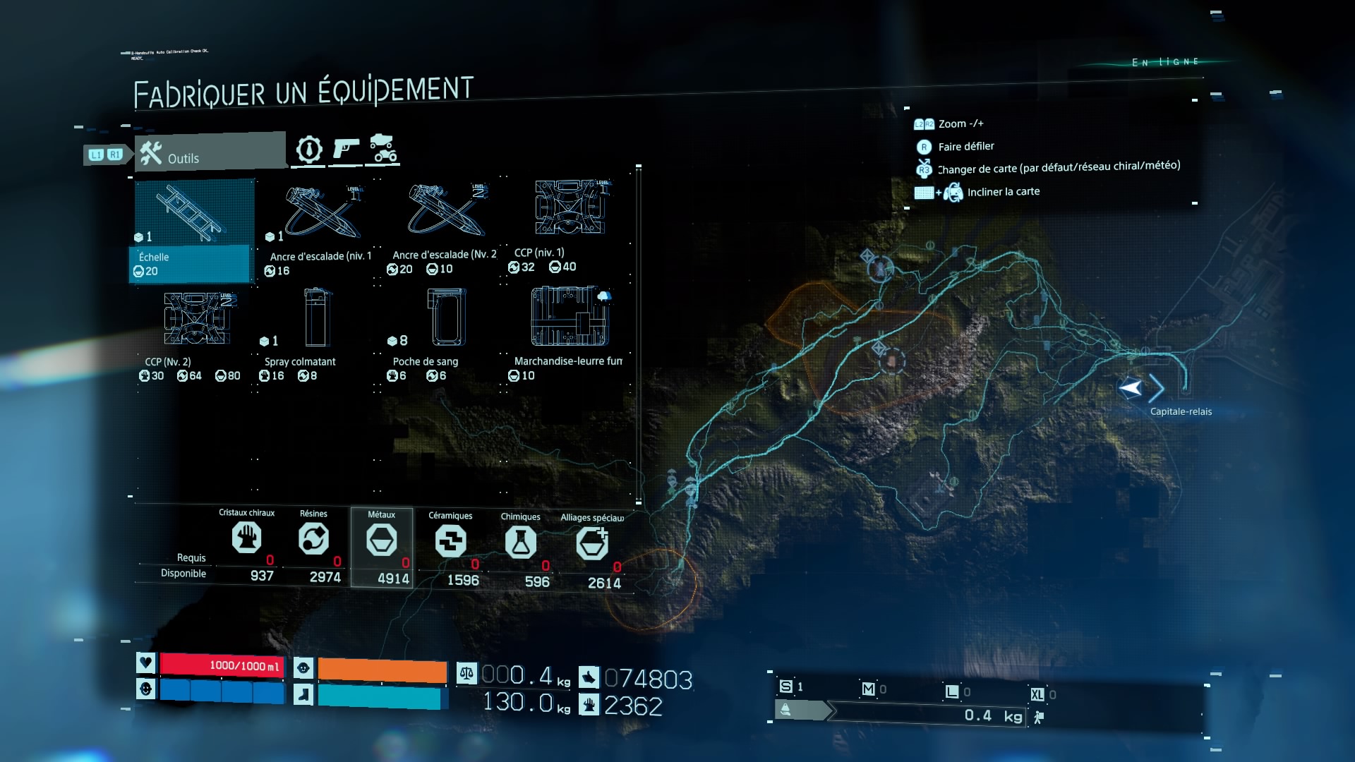 Dans Death Stranding, la notion de craft est assez importante. Ici nous ne parlons pas de craft “survie” comme pour les jeux de ce type, mais plutôt de fabrication d’outils et d’armes entre chaque mission. En effet, la fabrication ne peut se faire qu’en relais et sous certaines conditions.
