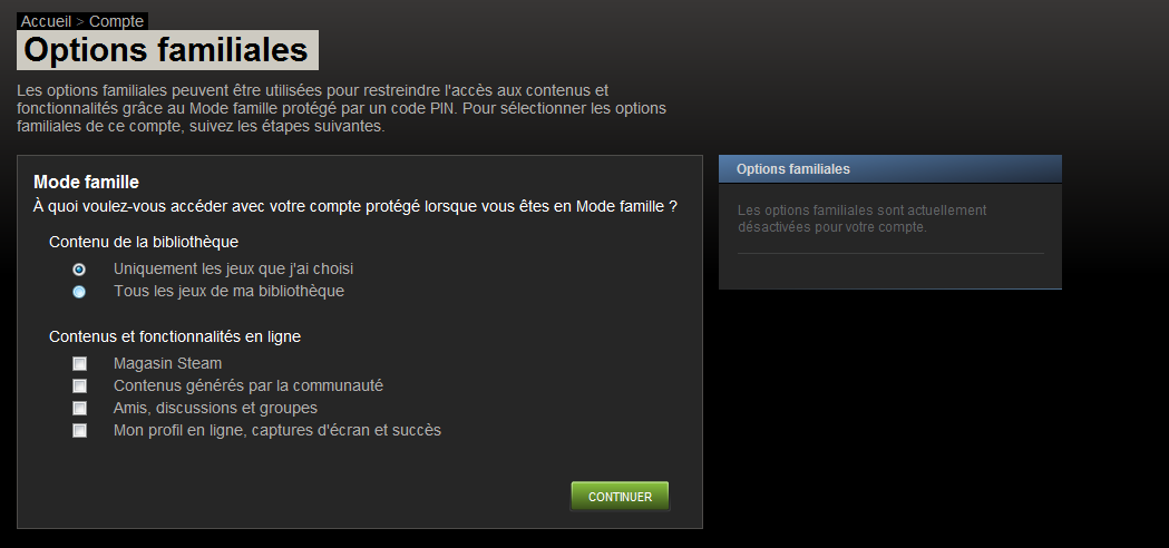 La fonctionnalité "Family Options" est en fait tout simplement une possibilité de mettre un contrôle parental sur un compte Steam via le biais d'un code PIN. Pour accéder à cette option rien de plus simple : Cliquez sur "Steam" puis sur "paramètres". Dans les onglets à gauche de votre fenêtre vous verrez maintenant l'onglet "Family" qui, comme mentionné vous permet de restreindre du contenu et des fonctionnalités, comme par exemple : - La capacité de bloquer certains jeux si ils sont trop violents pour vos enfants. - Empêcher un autre utilisateur que vous-même de faire des achats sur votre compte. - Bloquer les autres personnes que vous-même de voir le contenu généré par les groupes farfelus dont vous faites partie. - Empêcher votre conjointe de voir avec qui vous êtes amis et que ces amis ne démarre pas une discussions au mauvais moment. ;) - Bloquer l'accès à votre profil pour ne pas voir les 3500 heures que vous avez passées sur Counter-strike. Visuel de Family : Steam Family Options