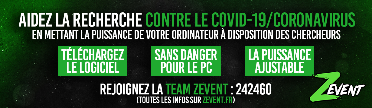 Afin de donner de la visibilité à Folding@Home, ZeratoR a partagé sur les réseaux sociaux une page tutoriel sur l’intérêt du projet et l’installation du logiciel. En suivant le guide, vous pourrez rejoindre l’équipe “Z EVENT” afin de regrouper toutes vos informations sous une même bannière. Cela n’a pas une grande utilité mais un site de Folding@Home propose un classement des équipes, petite gamification glorifiante de votre participation.