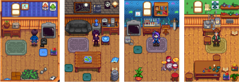 Votre partenaire apporte avec lui une partie de ses affaires, exclusives pour chaque PNJ. Comme vous le voyez ci-dessous, la salle de votre époux.se contient généralement son activité favorite. Vous pourrez ajouter ou déplacer les meubles de la pièce, si vous le souhaitez. Votre époux ou épouse peut aussi parfois changer de façon aléatoire le papier peint ou le sol d'une pièce de votre maison, c'est la surprise !