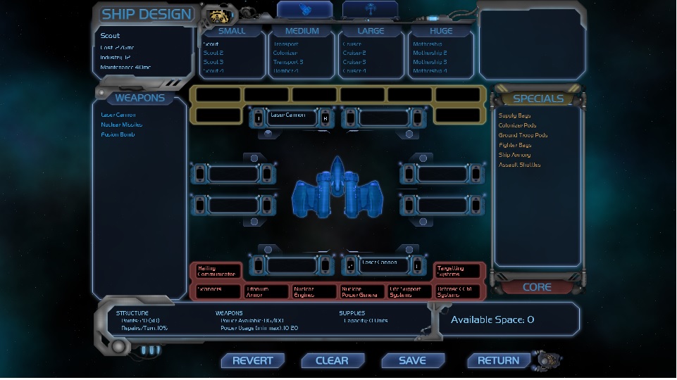 Grâce à celle ci, vous pourrez placer dans les emplacements prévus à cet effet divers armes, telles que des canons lasers, des missiles nucléaires ou des bombes à fusion. Les canons lasers font relativement peu de dégats mais touchent directement l'ennemi tandis que les missiles nucléaires font un peu plus de dégats mais peuvent être détruits avant l'impact. Les bombes à fusion quant à elles sont utilisés pour bombarder les planètes et détruires les colonies qui s'y trouvent. Vous pouvez aussi placer des modules spéciaux comme des baies de ravitaillement, des capsules de colonisation (pour conquérir des planètes), des légions de troupes, des esquadrons de drones de combat (idéal pour les vaisseaux mère), des systèmes de défense contre les abordages ainsi que vos propres navettes d'abordage. Bien sur, il faudra choisir subtilement les modules à placer selon les ressources de votre vaisseau visibles en bas de l'écran. Les éléments essentiels de votre vaisseau, comme la propulsion ou les scanners, ne peuvent pas être retirés et remplacer par autre chose. Cependant, ils peuvent être améliorés grâce à l'onglet "Techs" sur la carte de l'univers.