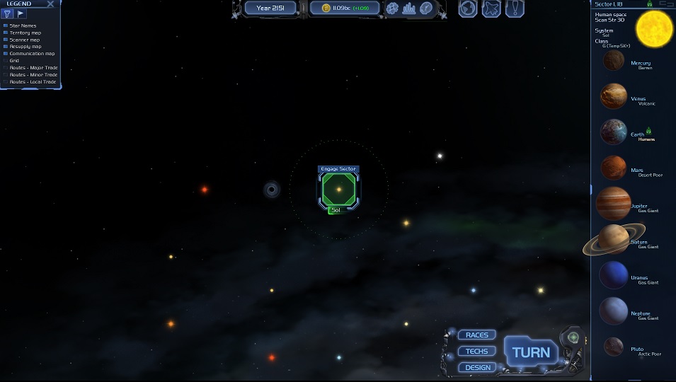 Malgré tout, il n'y a finalement pas grand chose à comprendre. L'interface est simple mais peu intuitive. Il faut tester beaucoup de choses soit même pour parvenir à ses fins. On peut y voir, à gauche du gros bouton "Turn", les boutons races, techs et Design que je détaillerais un peu plus loin dans ce test. A droite de l'écran se situent toutes les planètes du système solaire. J'ai par exemple cliqué sur la planète Terre ce qui a pour effet de faire apparaitre cette interface à l'écran :
