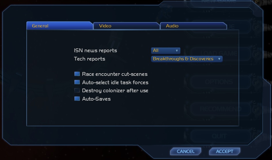 - L'onglet "General" propose de recevoir ou non les rapports des différentes actions en jeu, de couper les scènes cinématiques, de sélectionner automatiquement les forces inactives, de détruire le vaisseau permettant de coloniser d'autres planètes après utilisation ou de sauvegarder automatiquement.