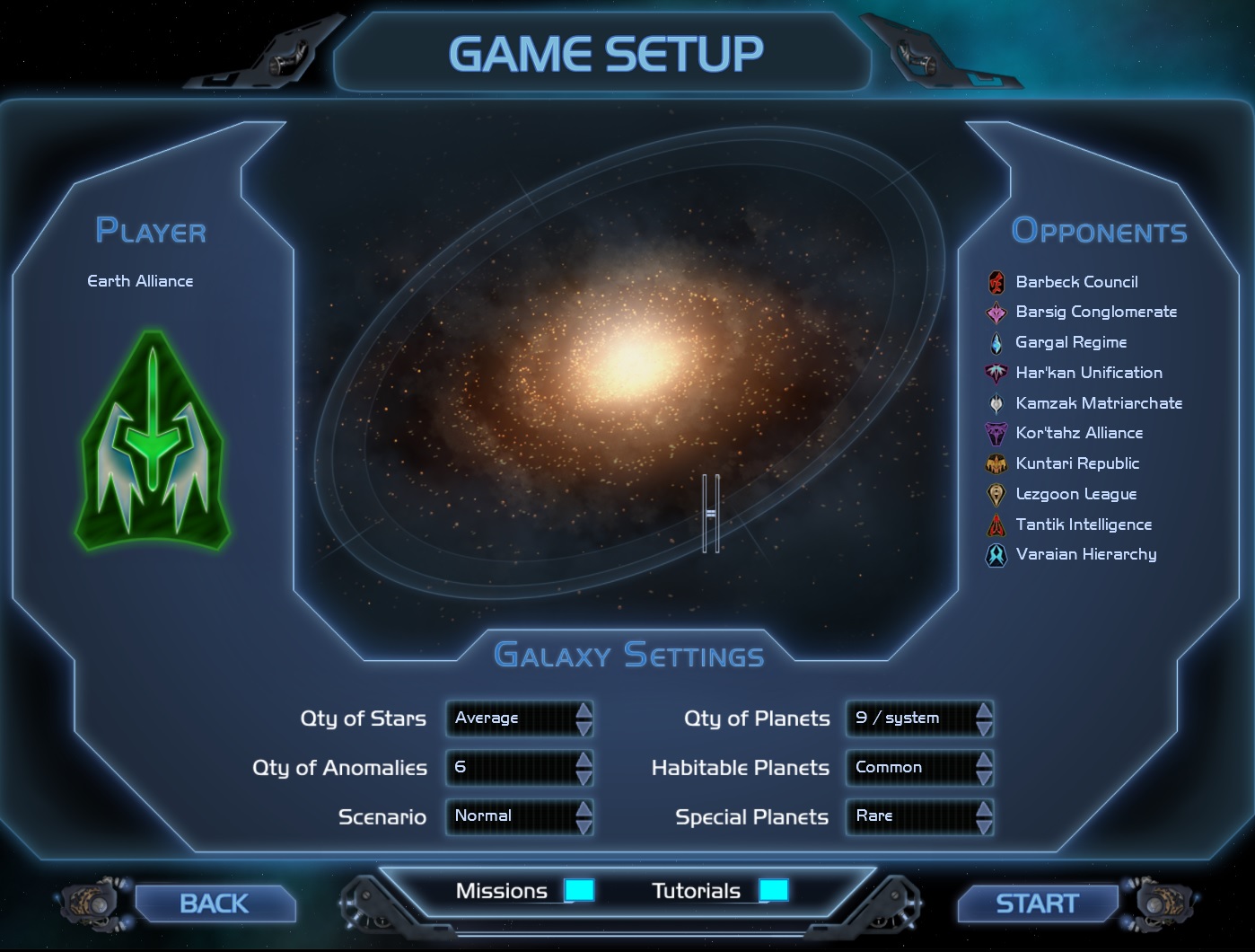 On peut noter sur la droite du menu la liste de nos opposants constituées de toutes les races précédentes (sauf les humains bien sur) mais aussi de races non jouables, telles que les Har'kans, les Kor'tahz ou les Varaians. Après avoir cliqué sur Start, on peut alors sélectionner la difficulté (de très facile à très dur). Pour ce test, j'ai choisi de jouer en normal.