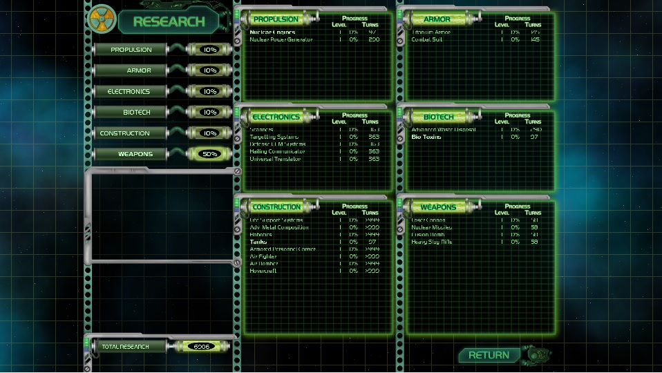 Il est alors possible de concentrer ses recherches sur une catégorie en particulier (50% des recherches) mais aussi de se concentrer sur un sous thème par catégorie. Ainsi et par exemple, je me suis ici concentré sur les armes, mais plus spécifiquement dans chacune des catégories sur le moteur nucléaire, les bio-toxines et les tanks qui apparaissent en gras par rapport aux autres sous thèmes.