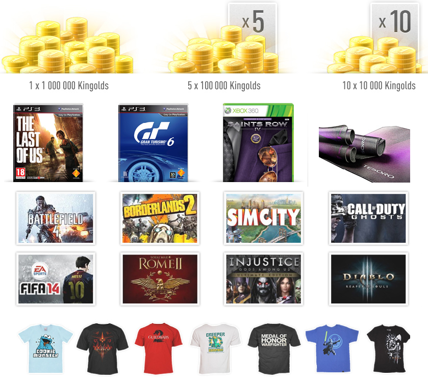 - 1 x 1 000 000 de Kingolds (1000€ de valeur sur le site Kinguin.net), 5 x 100 000 Kingolds (100€ de valeur sur le site Kinguin.net), 5 x 10 000 Kingolds (100€ de valeur sur le site Kinguin.net), 2 jeux Last of Us sur PS3, 2 jeux Grand Turismo 6 sur PS3, 3 jeux Saints Row 4 Commander chef édition sur Xbox360, 3 tapis de souris Aegis, 10 jeux Battlefield 4, 10 jeux Borderlands 2, 20 jeux Sim city, 10 jeux Call of Duty Ghosts, 5 jeux Fifa 2014, 15 jeux Total War Rome 2, 10 jeux Injustice Gods Among Us, 5 jeux Diablo 3 Reaper of Souls, différents t-shirts de femmes de level 77.