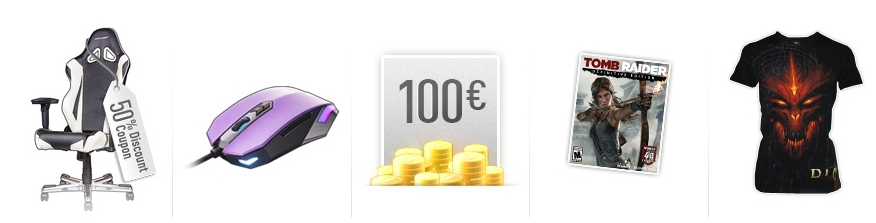 De gauche à droite : Coupon de réduction de 50% pour une DXRacer chair, souris Tesoro Gungnir H5, 100€ en liquide, Tomb Raider Définitive édition sur PS4 ou Xbox One, un T-shirt femme level 77.