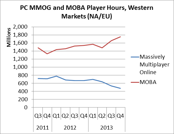 On peut constater qu'en moyenne, les joueurs ont passé 3 fois plus de temps sur des MOBA que sur des MMO en 2013.