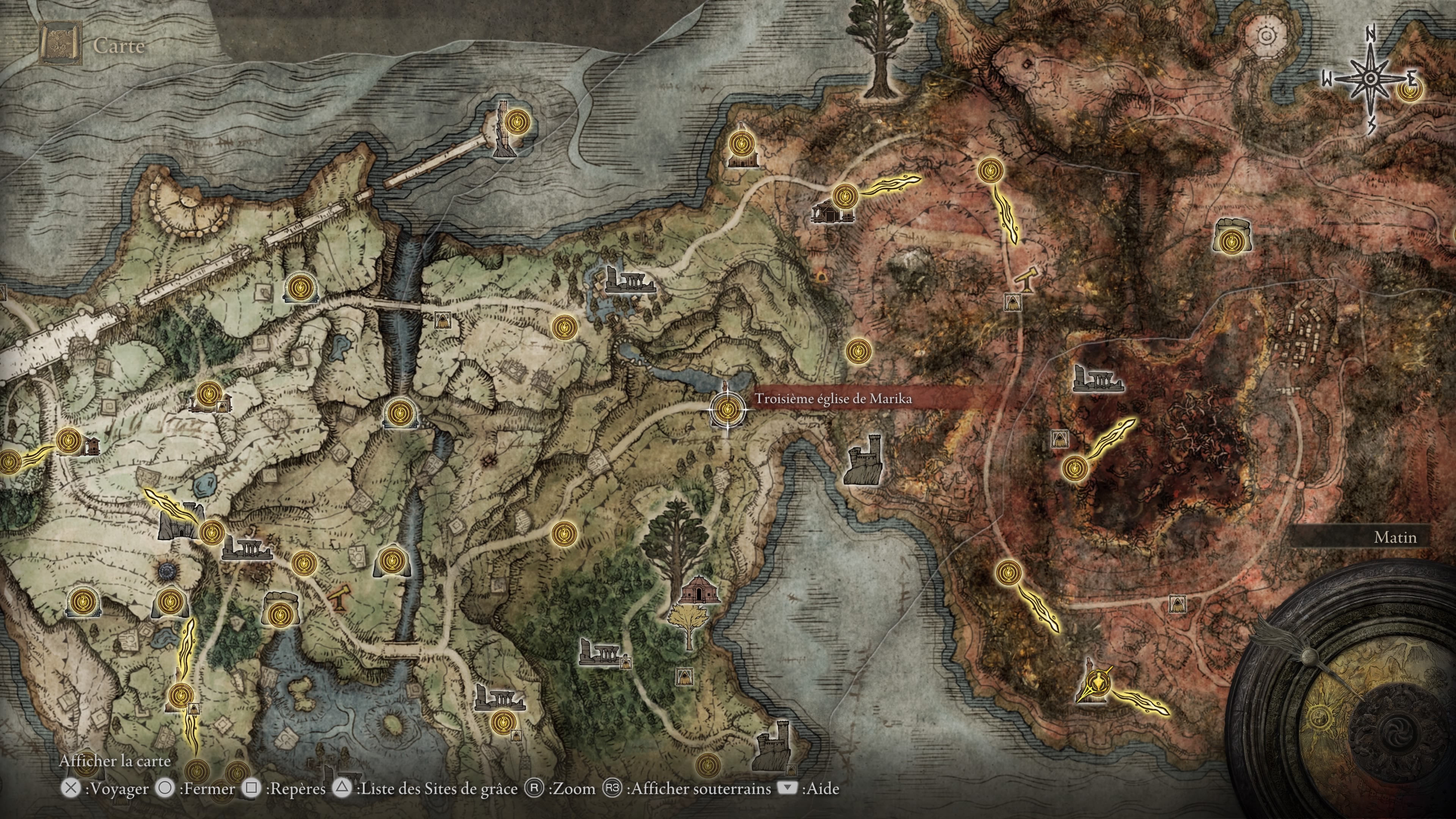 Une fois la monture récupérée, dirigiez-vous vers l'est à l'endroit indiqué par la carte pour trouver la troisième église de Marika. Une fois le site de grâce activé, dirigez-vous vers le nord-ouest à la recherche d'un téléporteur. N'ayez crainte et prenez-le !