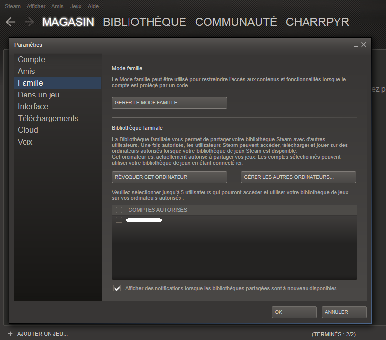 Pour bénéficier du partage familial, rendez-vous sur votre compte Steam, sélectionnez les paramètres et choisissez l'onglet Famille. Vous avez ensuite deux modes, le mode famille qui est l'équivalent du contrôle parental (et qui ne nous intéresse pas), et le mode Bibliothèque familiale. C'est la Bibliothèque familiale vous permet de partager votre bibliothèque Steam avec d'autres utilisateurs. Une fois autorisés, les utilisateurs Steam pourront accéder, télécharger et jouer à vos jeux sur des ordinateurs autorisés. Vous pouvez autoriser jusqu'à 10 ordinateurs afin de permettre l'accès à votre bibliothèque lorsque vous ne jouez pas. Deux boutons s'offrent à vous : "Autoriser/Révoquer cet ordinateur" et "Gérer les autres ordinateurs" Vous devez d'abord ajouter des comptes avec l'outil de gestion avant de les autoriser à effectuer le partage familial. Seuls 5 utilisateurs pourront accéder et utiliser vos jeux sur des ordinateurs autorisés (10). L'outil révoquer sera aussi utile si vous changez d'avis, ou d'amis (afin de bénéficier d'une bibliothèque plus conséquente par exemple:p).