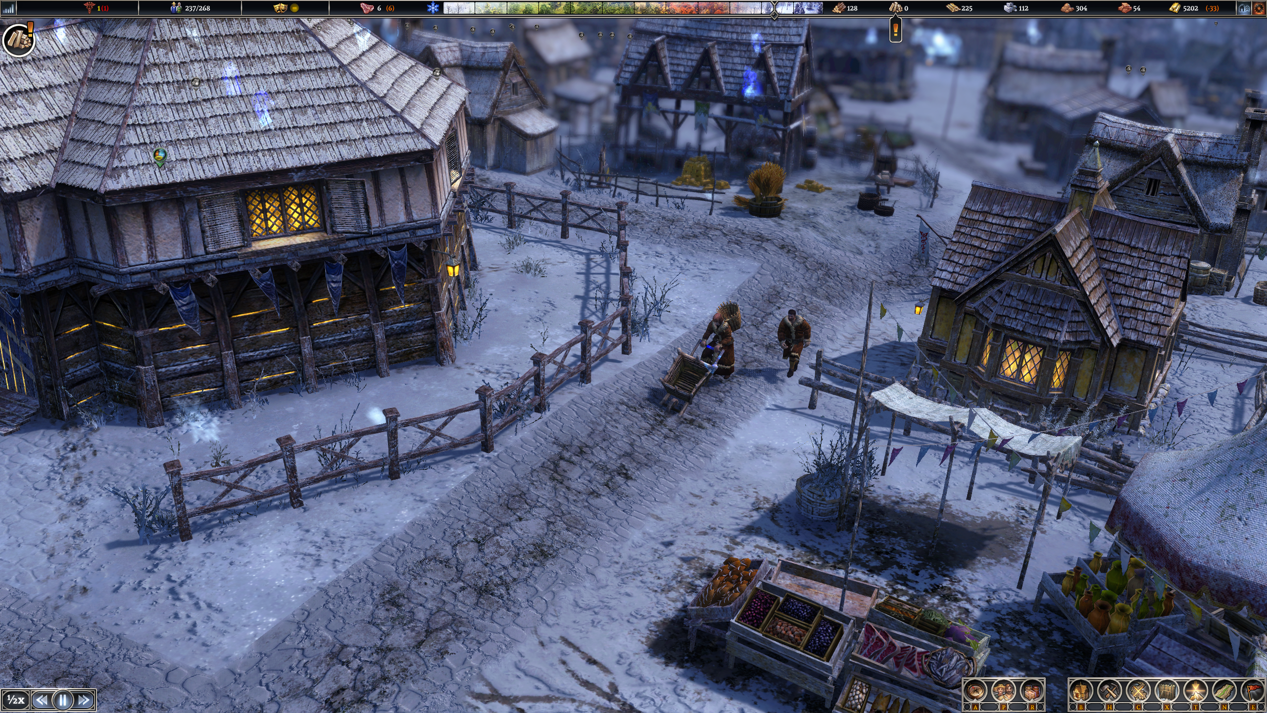 La cité se développe d'ailleurs plutôt rapidement et si l'on suit le bon équilibre entre besoins essentiels et l'effectif de notre population, on ne compte qu'assez peu de morts. Régulièrement, des familles étrangères viendront étoffer le village, en plus des naissances qui se font assez vite à partir du moment où le bonheur primaire (nourriture, chauffage et habitation) des habitants est rempli. On se retrouve alors avec un nombre assez important de villageois au chômage, le développement urbain ne pouvant pas toujours suivre l'évolution de la population. En outre, même si l'on vient à manquer d'une ressource en particulier, le comptoir de commerce (qui peut être développé assez rapidement) permet de remplir allègrement ce besoin et provoque, à partir de lui, un boom économique pour la cité.