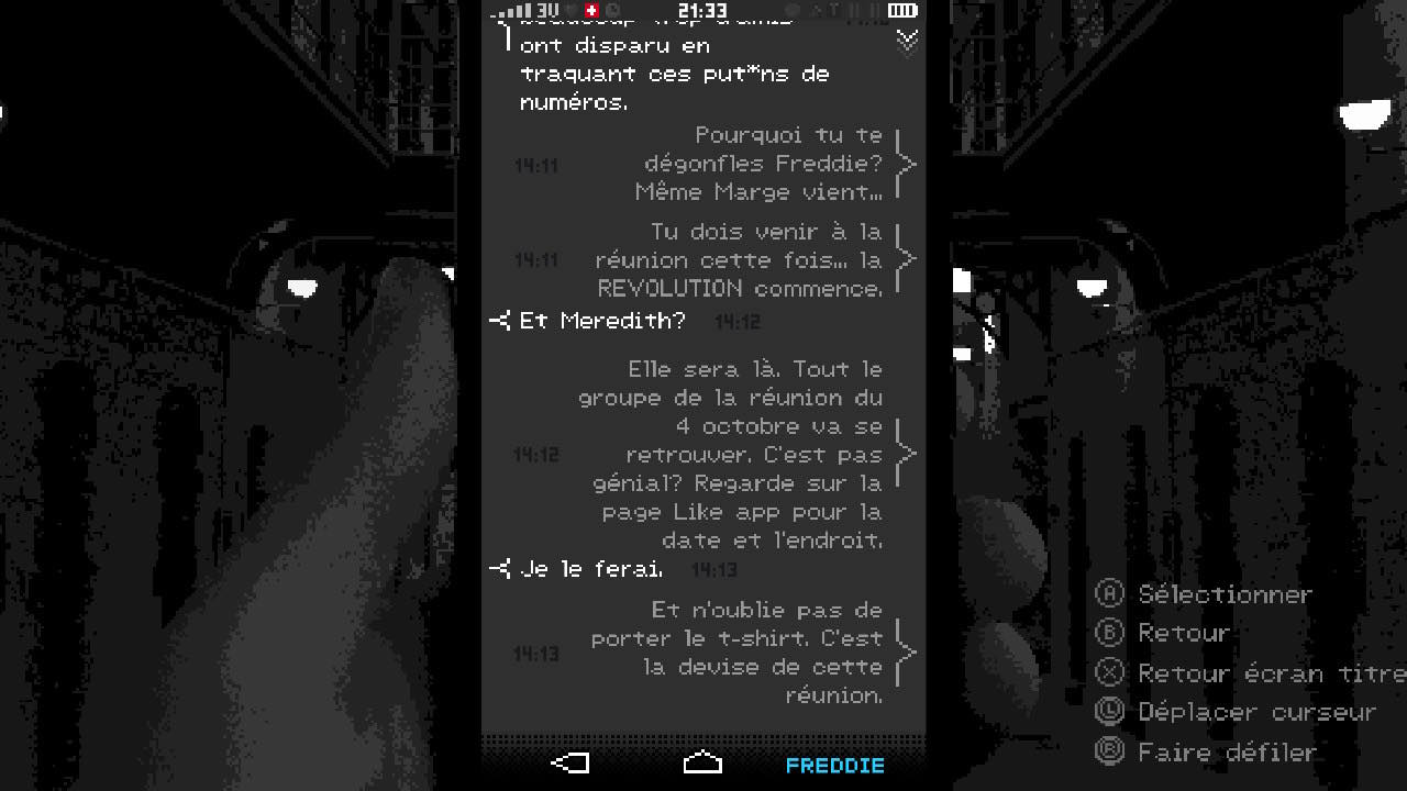 Le jeu mise beaucoup sur son scénario mais est également sur le pixel art comme dans la lignée de nombreux jeux indépendants. J'ai tout de suite accroché à cette interface de téléphone pixelisé. Le gameplay consiste à fouiller le téléphone à la recherche d'indices. Il faut cliquer sur des phrases, des photos afin de compléter les objectifs imposés par votre ravisseur. Vous êtes guidé par un numéro qui vous envoie régulièrement des sms ou vous appelle. D'autres personnages interviennent également, à vous de décider si vous souhaiter leur répondre ou non.