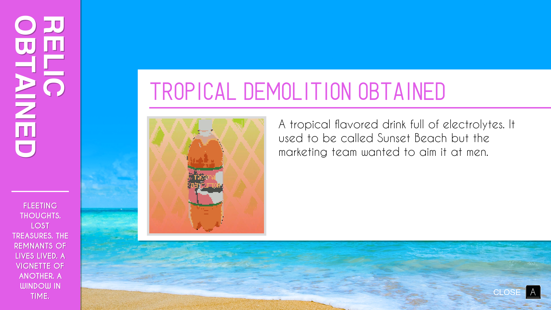 On peut ressentir un réel plaisir à baigner dans cette mer salée de références. Toutes ces stimulations interpellent alors nos souvenirs personnels. Paradise Killer fait en effet parfois l'impression d'une petite sucrerie nostalgique. Ce n'est pas étonnant, au vu de la multitude de contenus sur lesquels nos pensées peuvent s'attarder. Oli Clarke Smith dit sur le site du studio :