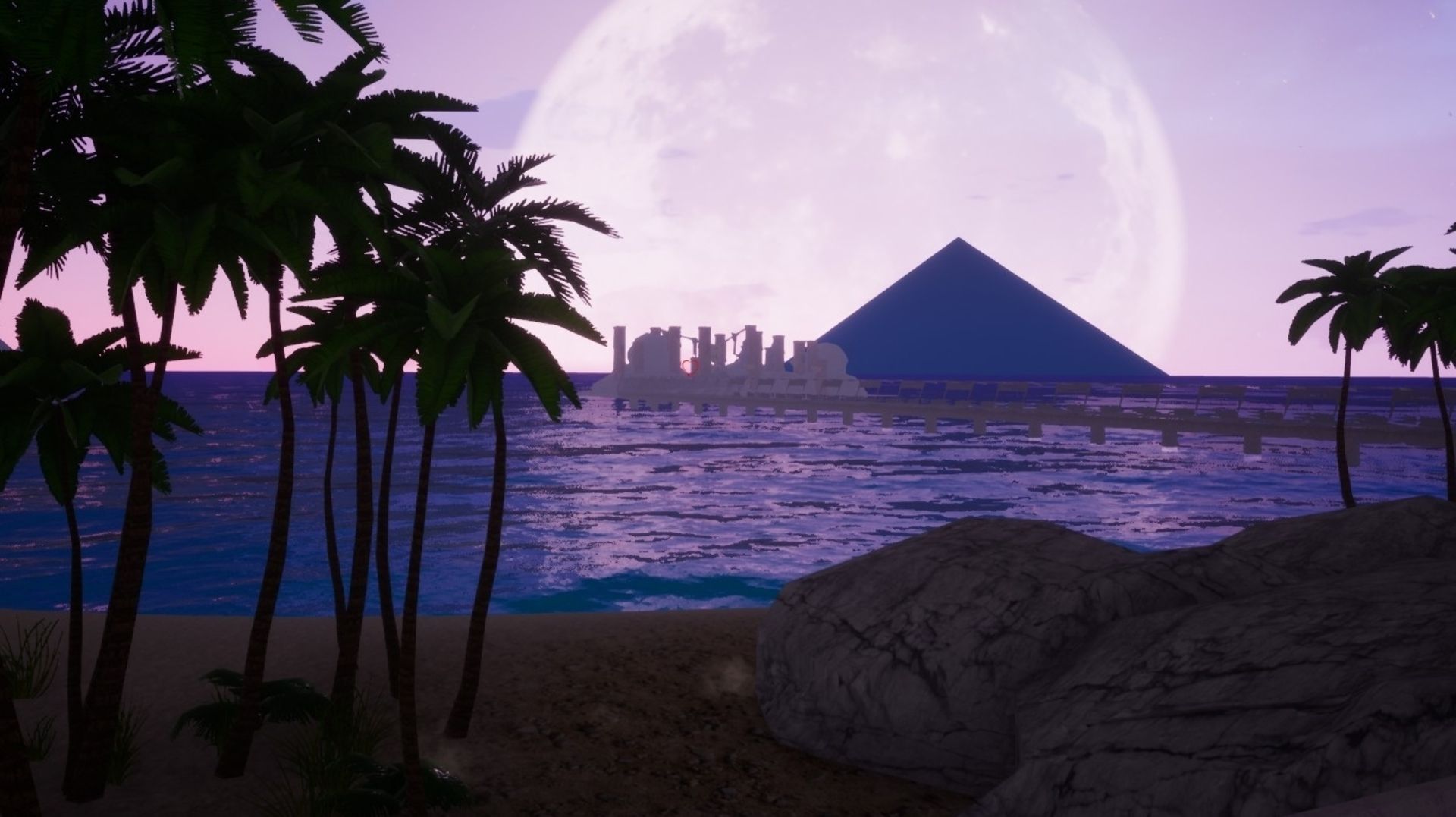 C’est aujourd’hui le statut de la mythologie grecque : ses dieux sont devenus des personnages littéraires, l’architecture divine des colonnes pour nos bâtiments publics, sa cosmogonie une fable qui fait rêver nos films Disney. Dans Paradise Killer, on peut de cette manière tomber sur des évocations divines. Enchanted Blue, Crying Grudge, Silent Goat, ces légendes sacrées modélisent l’architecture graphique de l’île. Parfois des statues pour embellir une plage, tantôt de petits temples qui demandent un paiement en échange d’une belle histoire. On pourrait pousser plus loin la métaphore en y voyant les grandes marques qui régissent notre monde et son marché.