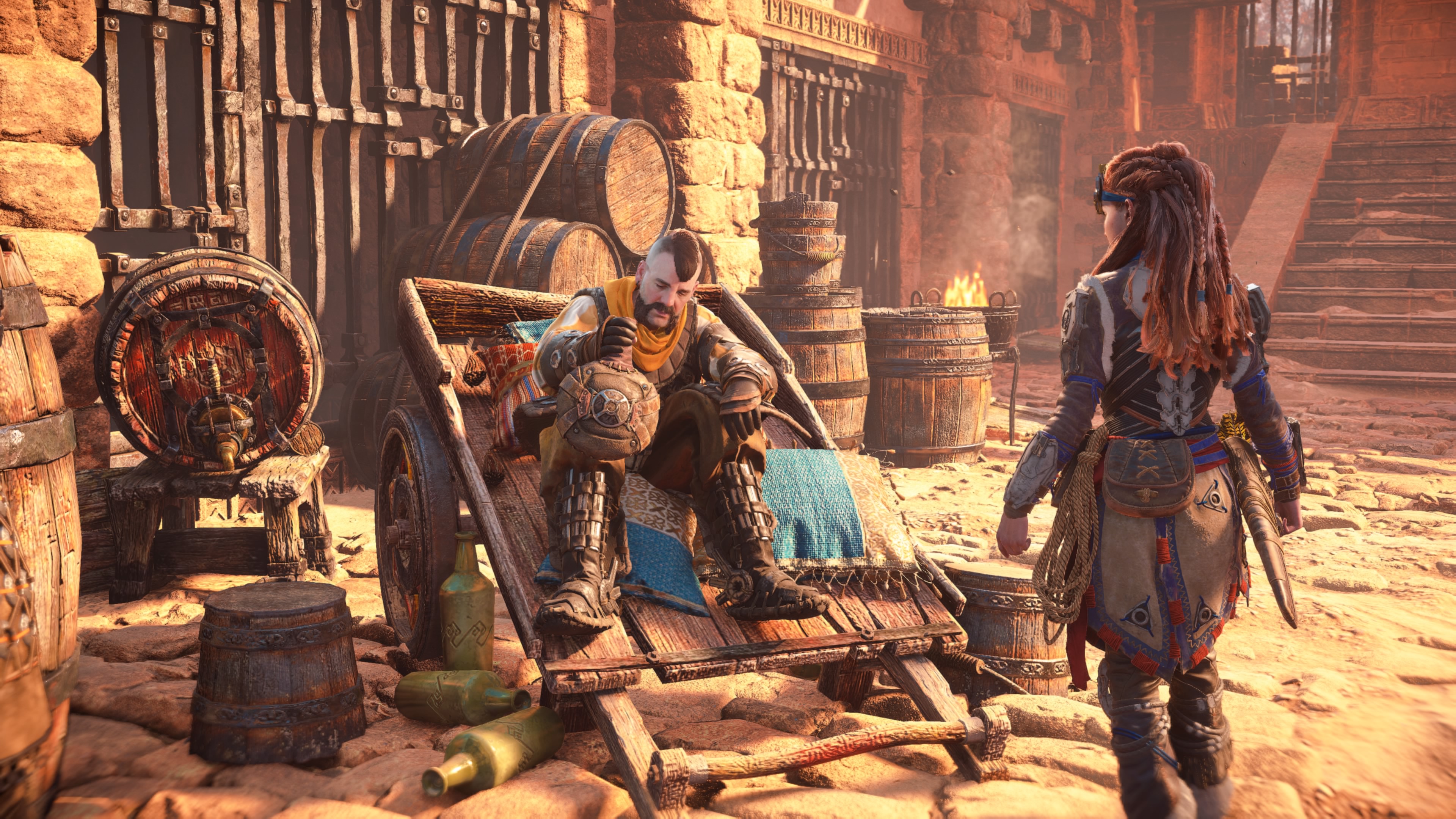 L'Ouest Prohibé montre encore une fois la qualité de l'équipe artistique de Guerrilla Games. En effet, parcourir l'open world est assez plaisant et bien que les premiers décors ne soit pas les plus passionnants, la donne change radicalement en cours de jeu. L'impression de découverte est constante et l'on veut toujours en voir plus. Même si Forbidden West ne déroge pas à la règle de la peur du vide des triple A à monde ouvert, le titre sait varier ses situation de jeu en y apportant une touche de lore ou un twist dans une activité somme toute banale. Voyons un exemple de ceci.Un exemple de quête secondaire