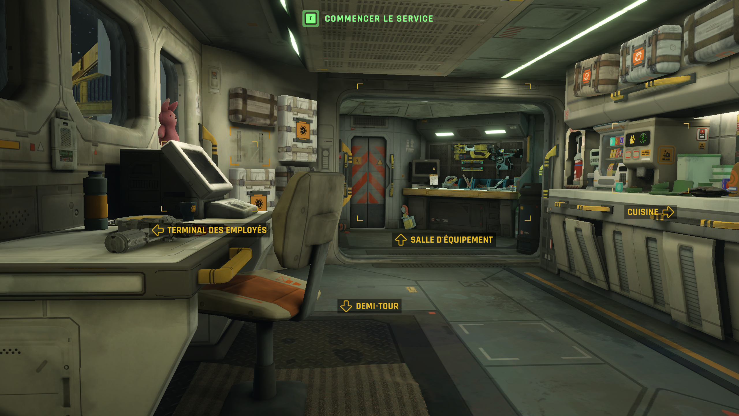 Si l’essentiel du jeu se passe sur le terrain au contact des vaisseaux, une partie non négligeable se déroule en préparation de la journée de travail. On dispose d’un modeste appartement dans lequel on trouve un terminal d’équipement. On peut y surveiller la durabilité des outils et les réparer si besoin, grâce à des kits dédiés, achetables au même endroit que l’oxygène et le carburant. Ce terminal permet également d’améliorer les outils avec des points récupérés au cours des découpes : Ajout de sangles sur le grappin, amélioration de la résistance à la surchauffe du découpeur, ainsi que la capacité en oxygène de la combinaison…