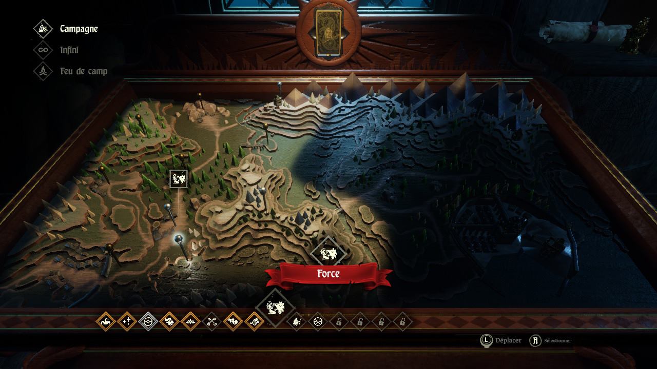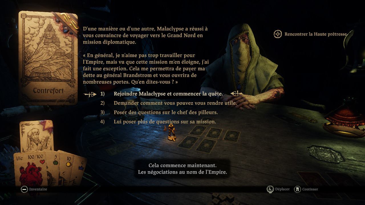 Vous devez avancer de cartes en cartes en résolvant les rencontres. Chaque nouvelle carte parcourue consomme une unité de nourriture. Si vous n’avez plus de ces denrées précieuses, chaque déplacement vers une nouvelle carte vous coûtera des points de vie.