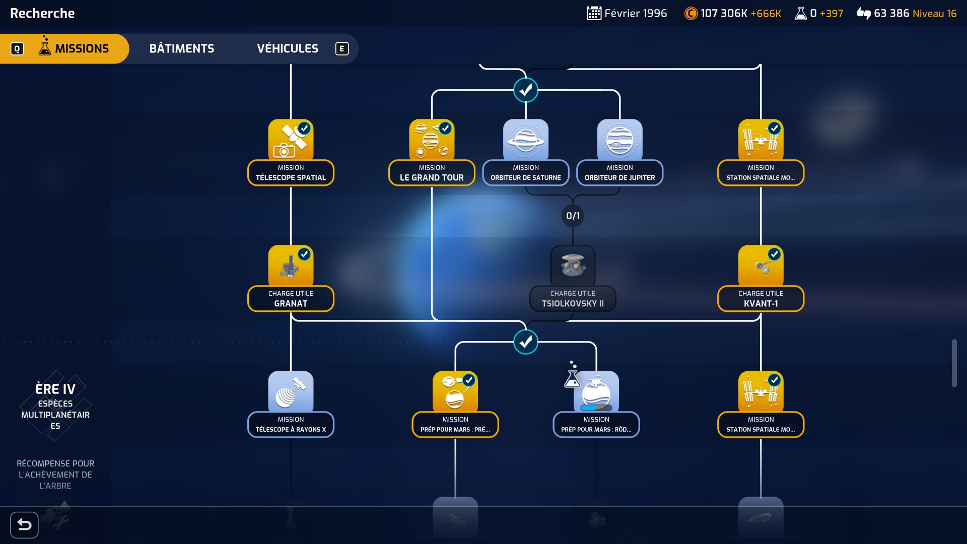 L’arbre Mission représente l’effort de vos scientifiques à réaliser tous les calculs nécessaires afin de réaliser une tâche et de créer la “charge utile” correspondante, par exemple la sonde Luna après avoir fait la recherche sur l’orbite lunaire ou Spoutnik 2, premier satellite a avoir amené un être vivant dans l’espace.